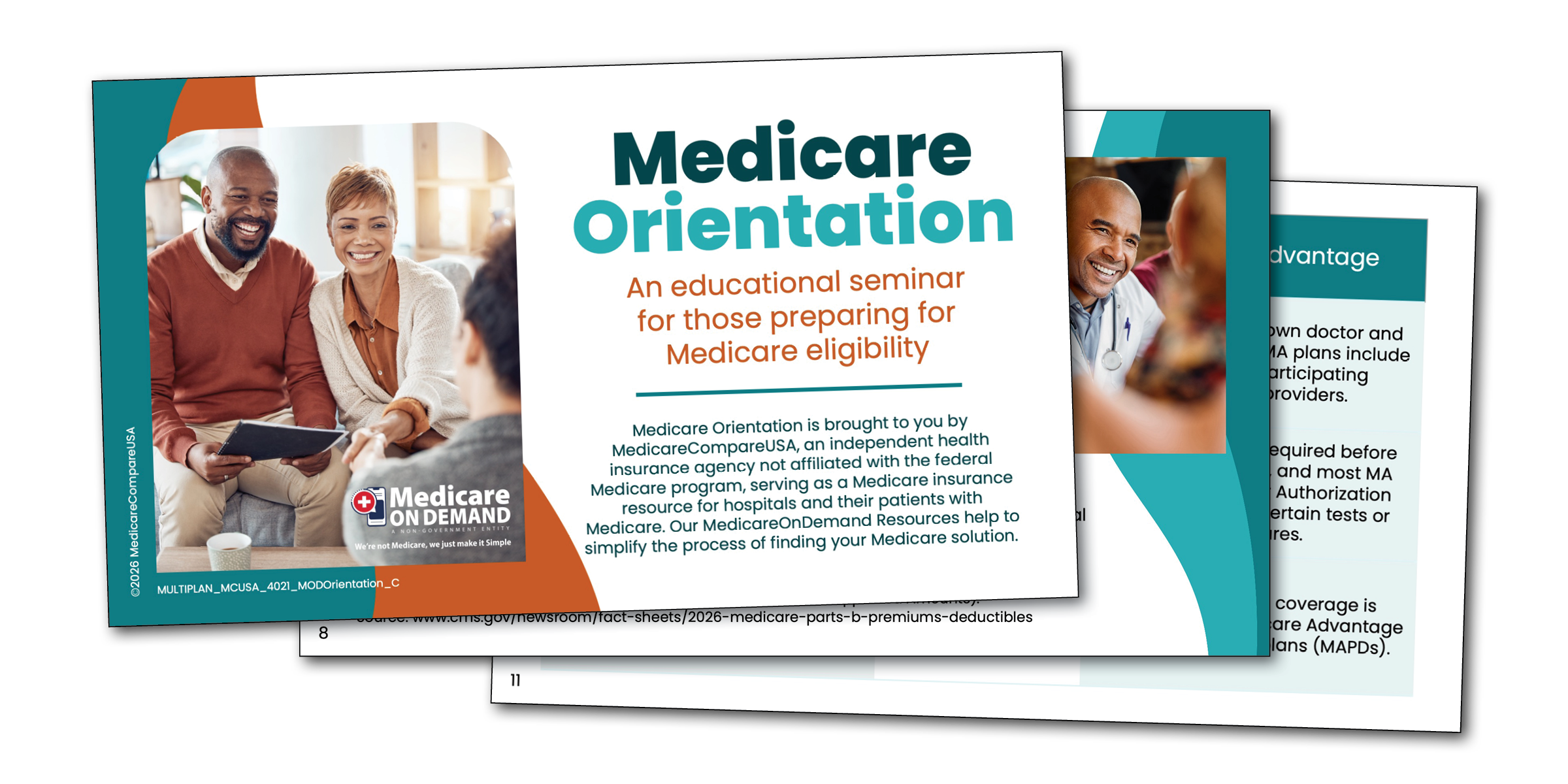 Are you looking for a polished PowerPoint presentation to walk your clients through Medicare? MedicareCompareUSA makes available an easy to use and fully compliant Medicare Orientation with benefit and cost-sharing information. We encourage agents to use our slide deck when conducting phone or in-person presentations. Sharing our Medicare Orientation with T65 prospects is a great way to help individuals understand Medicare and the various plan types that are available.